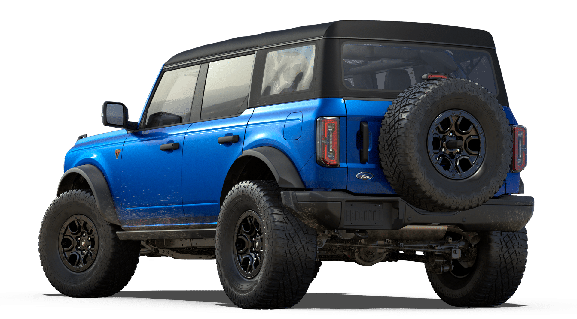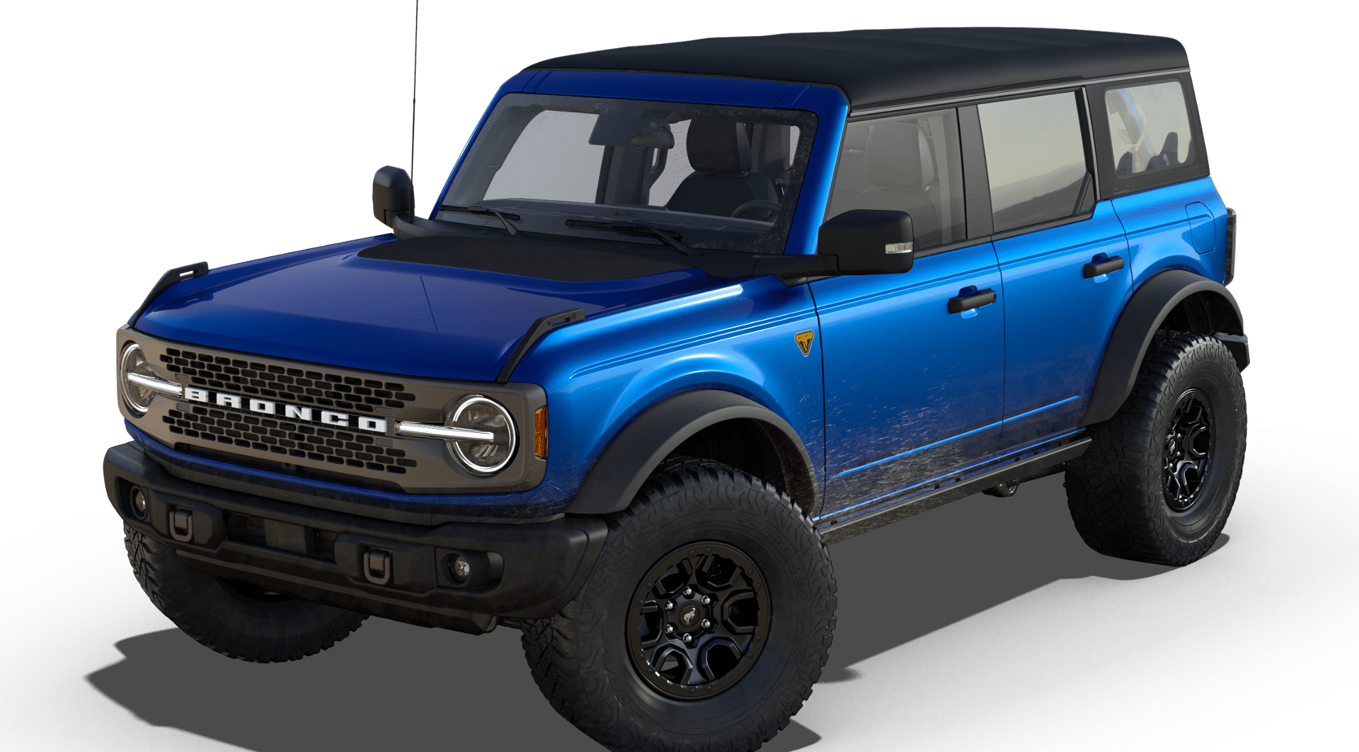 2025 Ford Bronco Badlands Bronco Badlands, 4D Sport Utility, 2.7L EcoBoost V6, 10-Speed Automatic, 4WD, Velocity Blue Metallic, 2-Door Intelligent Access w/Lock/Unlock, 360-Degree Camera, 4.7 Final Drive Ratio, 7 Speakers, Adaptive Cruise Control, AM/FM radio: SiriusXM with 360L, Ambient Footwell Lighting, Auto High-beam Headlights, Auto-dimming Rear-View mirror, Brake assist, Compass, Connected Navigation, Delay-off headlights, Dr & Pass Illuminated Sliding Visor Vanity Mirrors, Dual Smart Charging USB Ports, Dual-Zone Electronic Automatic Temperature Control, Electronic Stability Control, Equipment Group 334A Lux Package, Evasive Steering Assist, Exterior Parking Camera Rear, Front fog lights, Front Parking Sensors, Front reading lights, Front Row Heated Seats, Fully automatic headlights, Hard Top Sound Deadening Headliner, Heated door mirrors, Heated front seats, Heated steering wheel, High Clearance Fender Flares, High Clearance Suspension, Illuminated entry, Information on Demand Panel, Internet access capable: FordPass Connect, Leather Shift Knob, Painted Dual Tops, Panic alarm, Position-Sensitive Bilstein Shock Absorbers, Power door mirrors, Power Outlet - Back Side of Center Floor Console, Radio: B&O Sound System by Bang & Olufsen, Rear Parking Sensors, Rear-Window Defroster & Washer, Remote keyless entry, Sasquatch Package, Security system, Sideview Mirrors, Speed control, Split folding rear seat, Steering wheel mounted audio controls, SYNC 4, Tachometer, Telescoping steering wheel, Tilt steering wheel, Traction control, Trip computer, Universal Garage Door Opener, Wheels: 17 Carbonized Gray Painted Aluminum, Wheels: 17 Carbonized Gray-Painted Aluminum. Price includes: $2750 - Retail Customer Cash. Exp. 04/30/2026