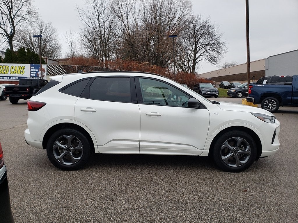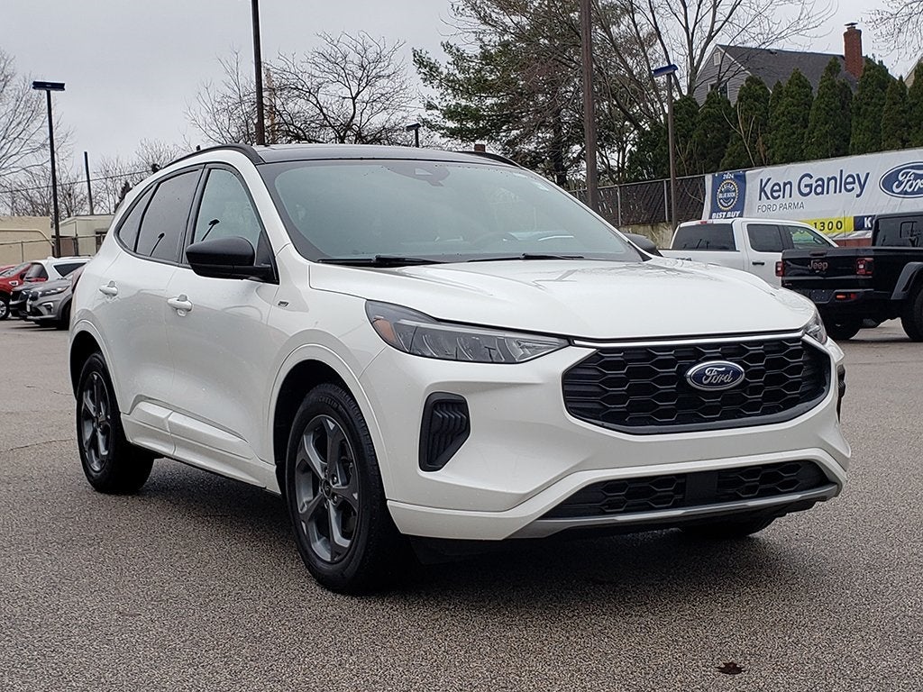 2024 Star White Metallic Tri-Coat Ford Escape ST-Line ACCIDENT FREE CAR FAX HISTORY, LOCAL TRADE, ONE OWNER!!, Escape ST-Line, 4D Sport Utility, 8-Speed Automatic, AWD, Star White Metallic Tri-Coat, Red / Ebony Cloth, 4-Wheel Disc Brakes, ABS brakes, Adaptive Cruise Control w/Stop-and-Go, AM/FM radio: SiriusXM, AM/FM Stereo, Automatic temperature control, Black Roof-Rack Side Rails, Brake assist, Cold Weather Package, Connected Navigation, Delay-off headlights, Dual front impact airbags, Dual front side impact airbags, Electronic Stability Control, Emergency communication system: SYNC 4 911 Assist, Equipment Group 300A, Exterior Parking Camera Rear, Ford Co-Pilot360 Assist+, FordPass Connect, Four wheel independent suspension, Front dual zone A/C, Heated Front Row Seats, Heated Sideview Mirrors, Heated Steering Wheel, Illuminated entry, Knee airbag, Low tire pressure warning, Overhead airbag, Panic alarm, Panoramic Vista Roof, Power door mirrors, Power driver seat, Power Liftgate, Power steering, Power windows, Rear Parking Sensor, Rear window defroster, Rear window wiper, Rear-View Camera, Remote keyless entry, Remote Starter System, Speed Sign Recognition, Speed-sensing steering, Speed-Sensitive Wipers, Sport steering wheel, Steering wheel mounted audio controls, SYNC 4, SYNC 4 w/Enhanced Voice Recognition, Tech Pack #1, Telescoping steering wheel, Tilt steering wheel, Traction control, Variably intermittent wipers, Vinyl/Cloth Front Sport Contour Bucket Seats, Wheels: 18 Rock Metallic Painted Aluminum. Clean CARFAX. CARFAX One-Owner. 26/32 City/Highway MPG Odometer is 6435 miles below market average! Thank you for taking the time to look at this terrific 2024 Ford Escape. As you do your comparison shopping, you will see Ken Ganley Ford Parma offers some of the best values in the market. We will provide you a Carfax, Comprehensive Vehicle Inspection, and how we arrived at the price. We may not always be the lowest but if you want to know who is; we will show you that too. Call or stop by Ken Ganley Ford located in Parma Ohio to schedule a test drive today.
